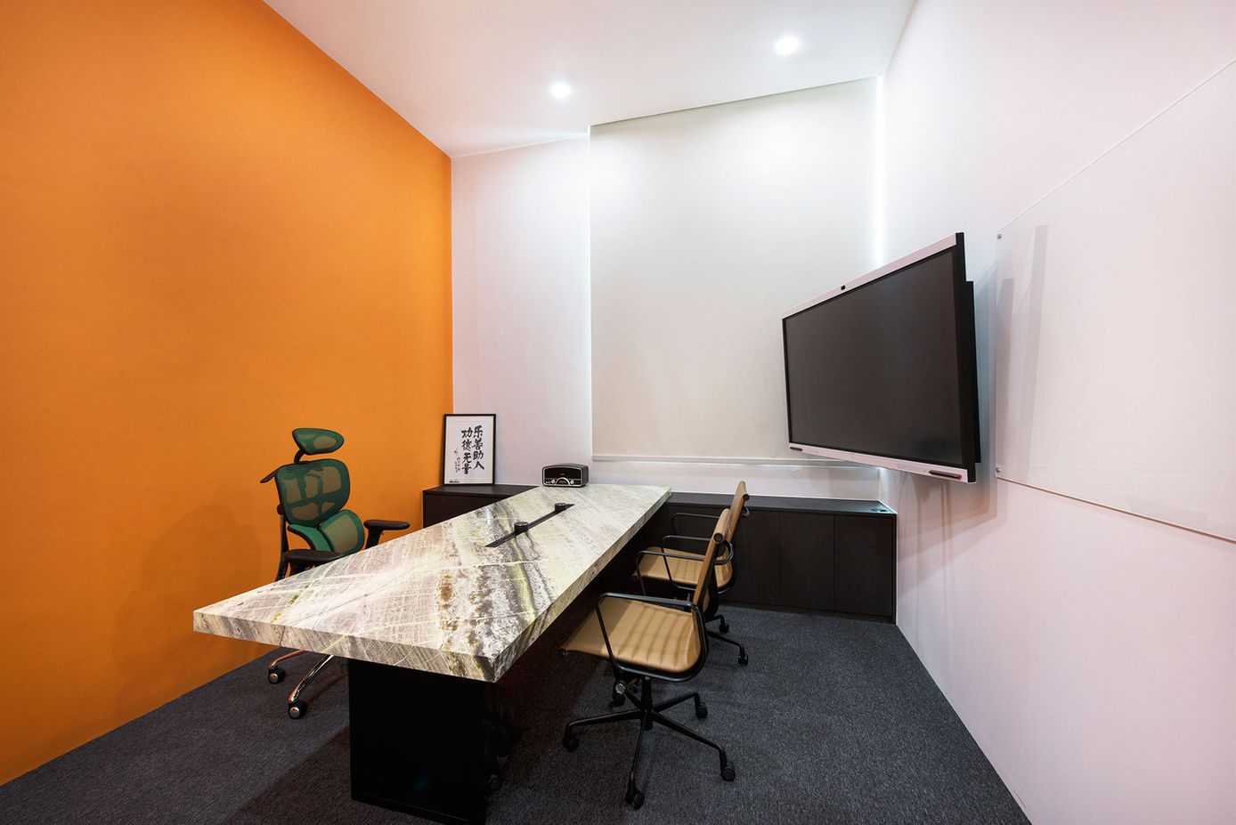 The office space is greeted with a distinct display of corporate logo at the entrance leading towards the lounge area. The exclusive CEO room is planned beside the conference room for convenience yet both space have their own privacy. The conference room fits a 85-inch TV for comfortable seats of 13 person.